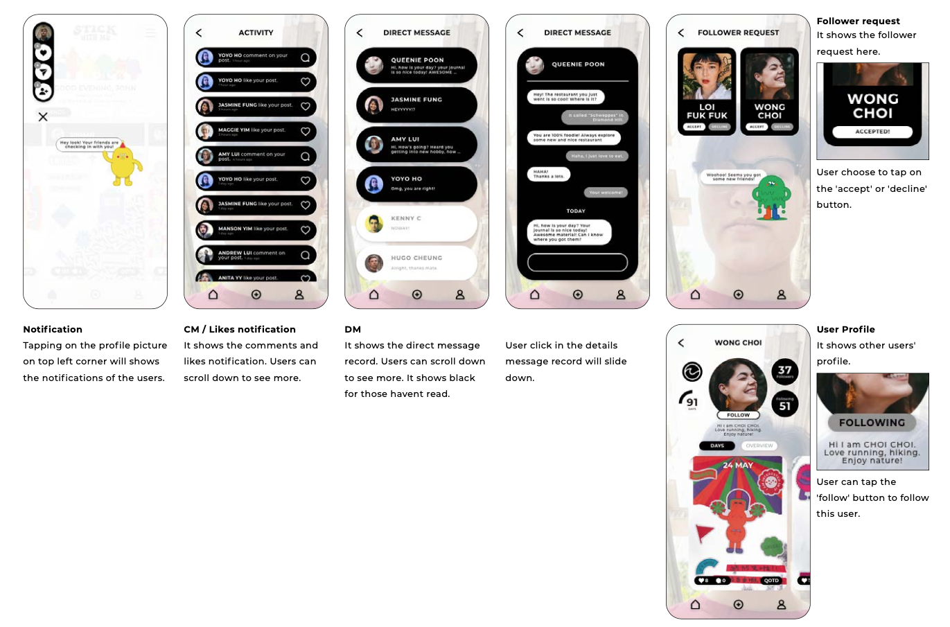 App - Social media app is another main focus in this project, as it used to assist with the journal to carry out some of the objectives. Besides of the basic social platform to share users’ journals, make friends, likes and comments or the list go on, there will also be some specialised functions included in the app. Firstly, a video auto generator is provided for the users to record their journaling process, as that is the most soothing event. With the sticker tearing or even the writing sound, it is stress-relieving to watch.Secondly, ‘a quote of the day’ and ‘emotion summary’ are allocated for each journal. With the use of stickers, it can generate the emotion summary of the day. Based on that, a quote of the day will be allocated to it, in order to inspire or encourage them.Thirdly, the app can link you with users around the world who share similar journals with you. With such common ground, users who are connected can have sharing based on their journal content and potentially be friends.