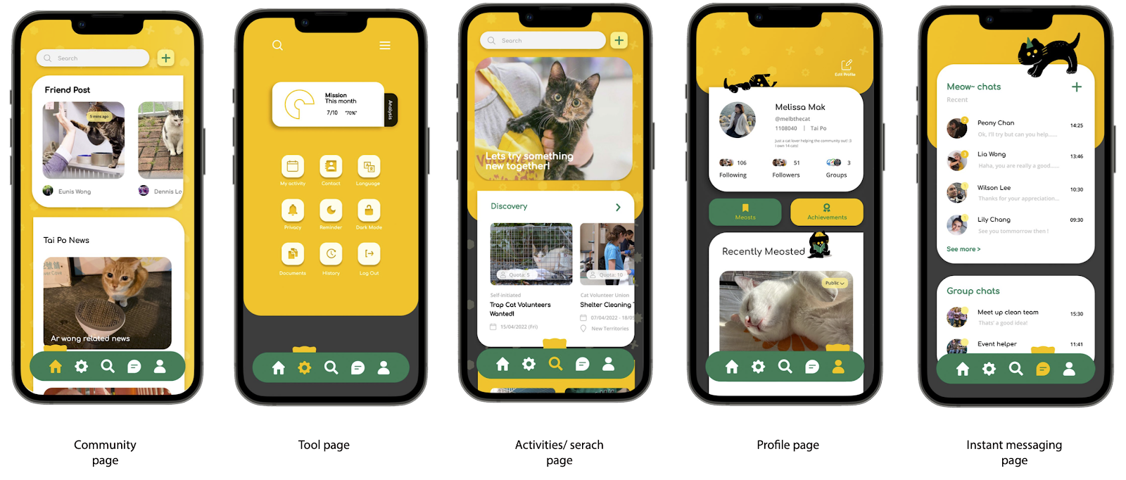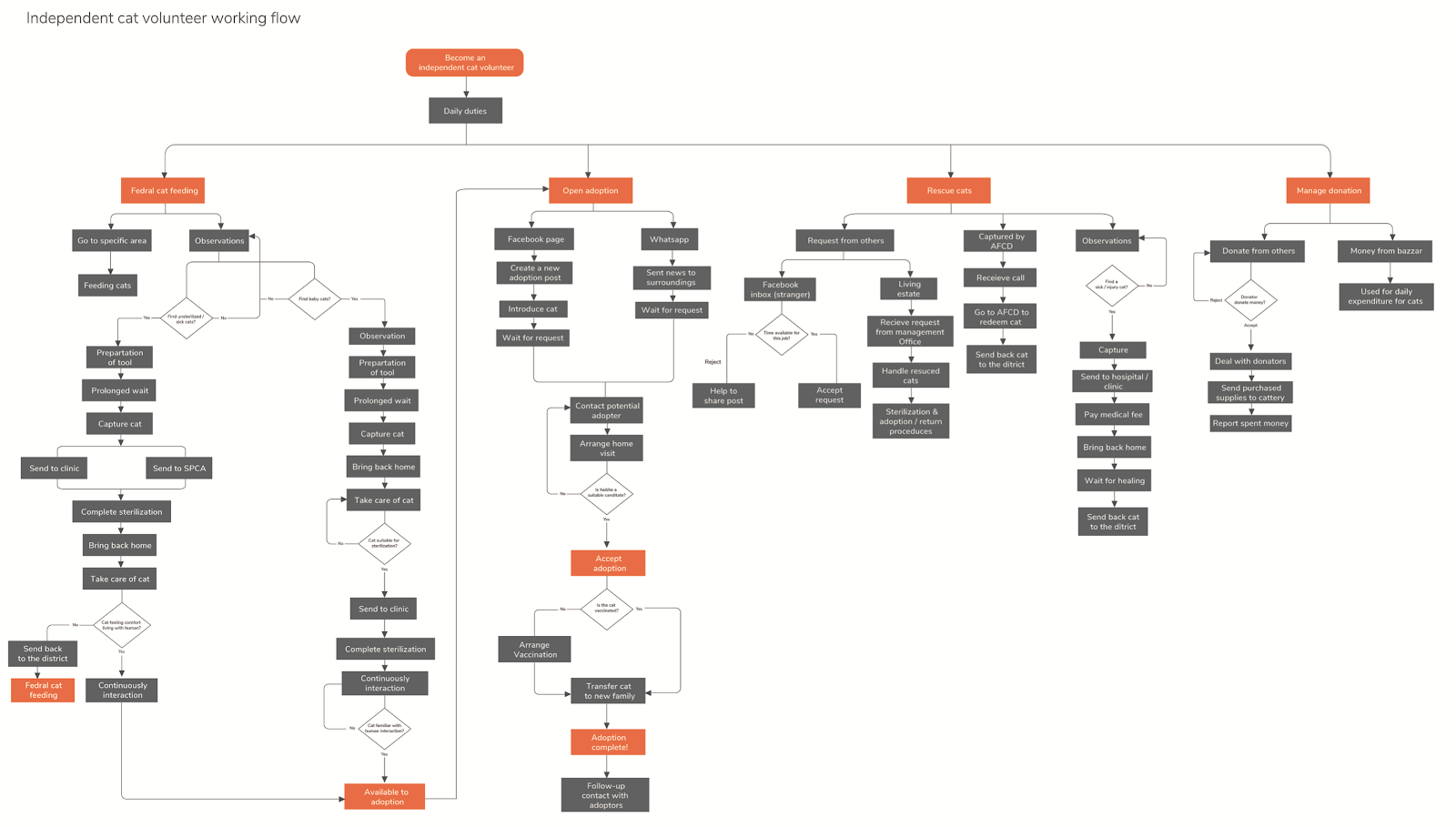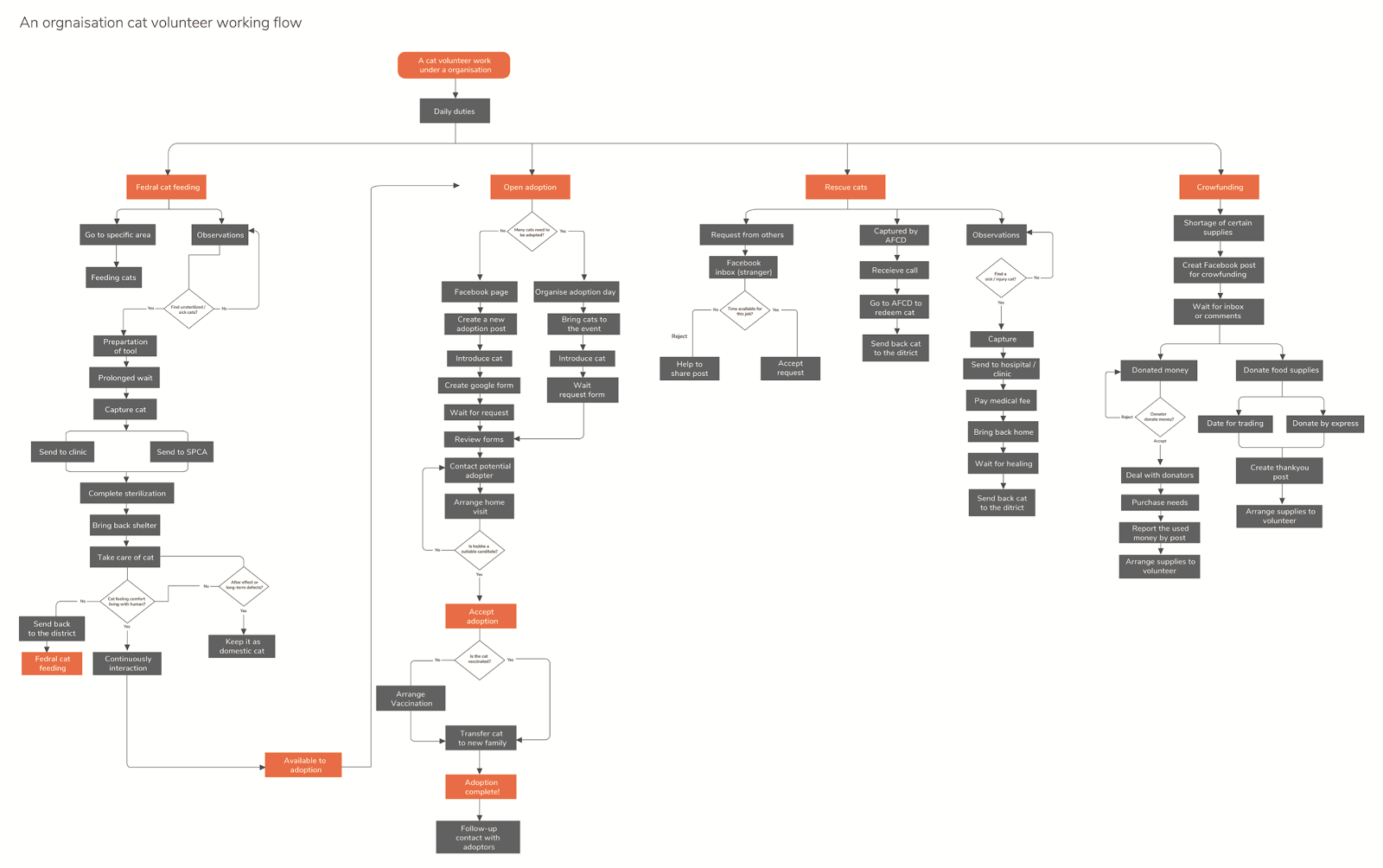 Cat volunteers by Mak Yi Ting Melissa The design is hoped to be cross platform design. The users’ role will evolve through level of experience changing and during each stage. They would require different kinds of deliverables to meet certain targets.User case studies in anatomy flowchart in different service mobile applications were done in capstone 1 , as it was one proposed deliverable when the project was still focusing on how cat’s volunteers perform their daily tasks and pattern on how they communicate.The website will include pages of each activities which introduce how it run and people can participate the activities in pages.Also, it will include a page call " 區 區 有 貓 ", user can directly click specific location on map to review the fedral cats' infomration around them and visit their location. Also they can posted photos they found satified to share in the webpage to involve a invisible interaction.