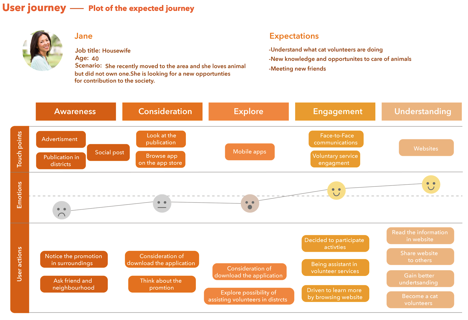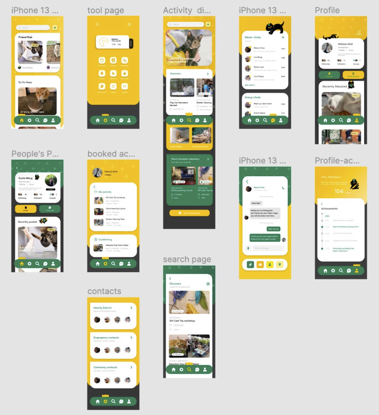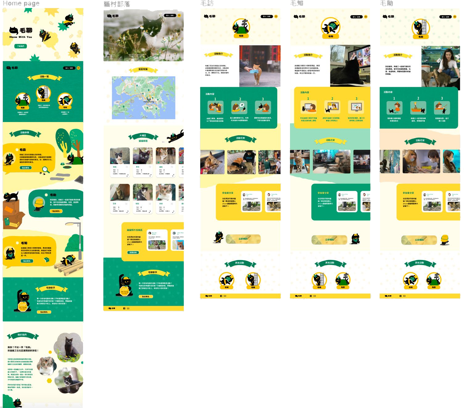 Cat volunteers by Mak Yi Ting Melissa The design is hoped to be cross platform design. The users’ role will evolve through level of experience changing and during each stage. They would require different kinds of deliverables to meet certain targets.User case studies in anatomy flowchart in different service mobile applications were done in capstone 1 , as it was one proposed deliverable when the project was still focusing on how cat’s volunteers perform their daily tasks and pattern on how they communicate.The website will include pages of each activities which introduce how it run and people can participate the activities in pages.Also, it will include a page call " 區 區 有 貓 ", user can directly click specific location on map to review the fedral cats' infomration around them and visit their location. Also they can posted photos they found satified to share in the webpage to involve a invisible interaction.