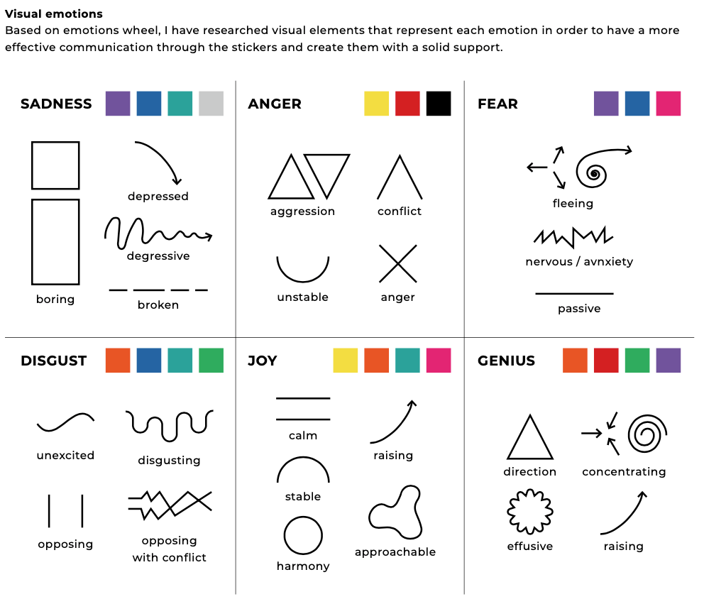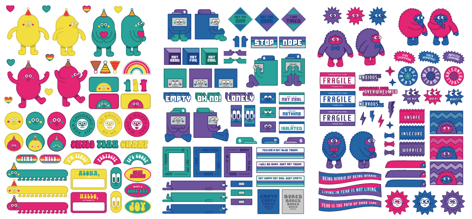 Emotion Stickers - What emotions? So as to wholly covering all the emotions in the stickers, it is fundamental to understand the feelings and emotions. I have referred to the emotion wheel from Abby Vanmuijen. There are a total six main emotions and along with related emotions respectively.What sticker? In order to maintain the consistency of the sticker design, I decided create a main character for each emotion and develop other related stickers. These related stickers include some quotes and objects. On the other hand, some pattern and plain colour stickers will also be provided, so as to provide them enough materials to create different combinations and their own unique journal.What sticker format? Stickers can have many different forms, such as a roll, die cut individually or on a piece. The character and the related sticker will present in an individual die cut format, instead of on a piece. As without grouping them on a piece, it can avoid limiting the choice of the sticker for the users.Besides, the pattern sticker will present as a sticker sheet, as it gives full scope to creativity for the users, they can cut it with scissors or tear it by hand as they wish. Plain colour sticker tape, furthermore, will be provided in the journal kit for other uses, such as neutralising the journal layout with other stickers, attaching users’ stuff (e.g. photos, tickets) on the journal or writing note on it.