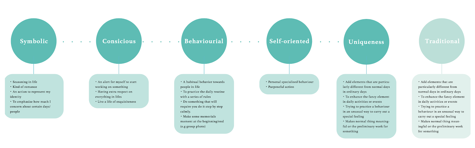In Hong Kong, no matter whether students or adults encounter lots of workload each day, it is not uncommon that our schedule is crammed with different tasks. According to the world happiness index, Hong Kong only ranked at 77 and scored 5.477 out of 10, which shows that most of the Hong Kong citizens do not feel delighted about their lives in recent years.After dealing with this kind of pressure each day, I would always have a thought pop up in my mind: " everyday is tedious and repeated in my life.” Personally, it is hard for me to find motivation towards everyday life because I do not find life interesting, everyday is the same from my view.My hypothesis is that such kind of repetitive and busy schedule does not create much freshness in our life, which is making our life living in a dull and repeated schedule, which is easy to lead to negative emotion, therefore adding some little spark moments to add some details in life could enhance the entertainment and satisfaction in life.Sin & Lyubomirsky (2009) suggested that some simple cognitive and behavioral activities which people can apply in daily life have been found to foster happiness. Therefore, the method and advantage of practicing a sense of ritual would be emphasized and explored in my capstone project, and attempt to find out the positive relationship between well-being or sense of ritual to enhance people's happiness of life.