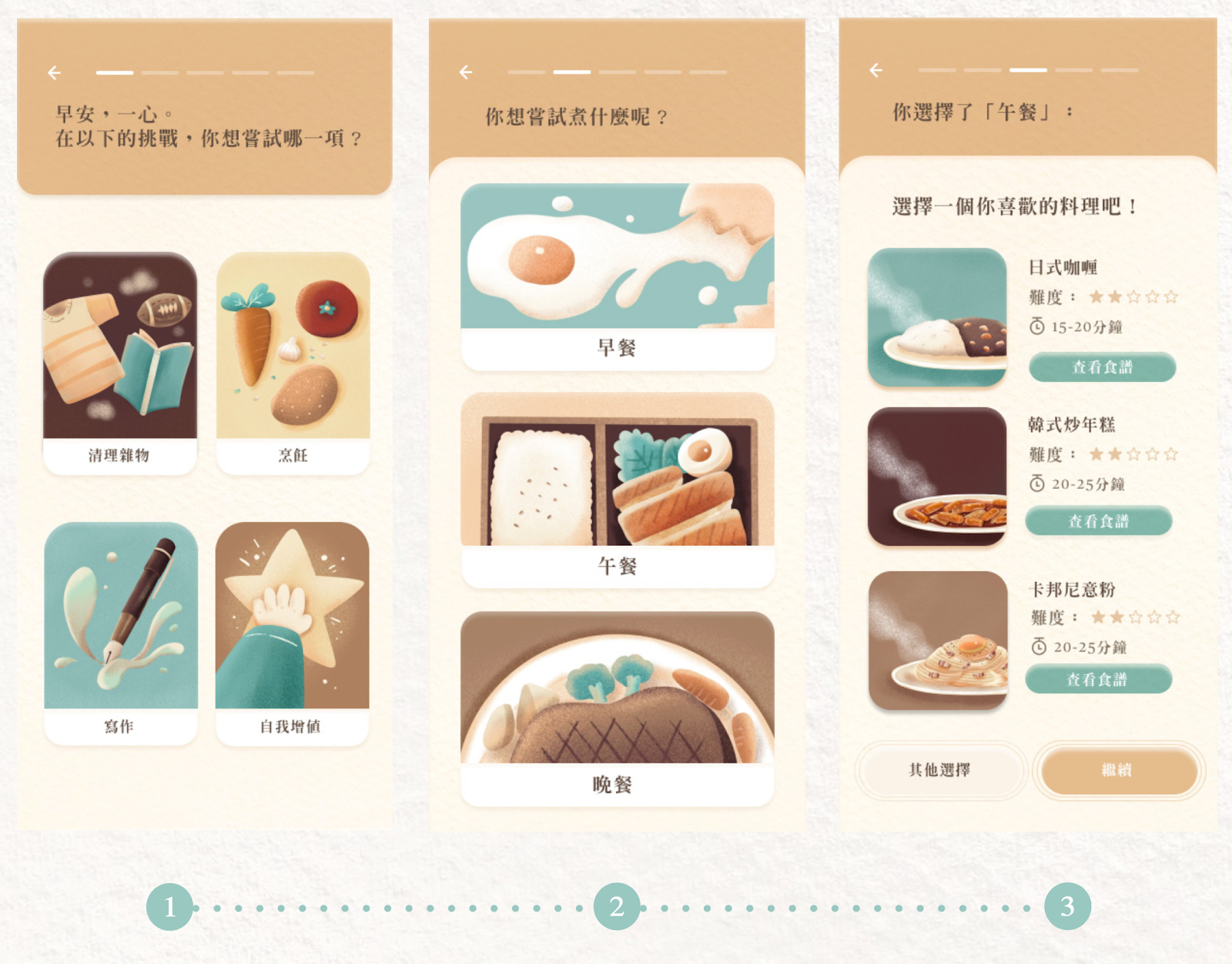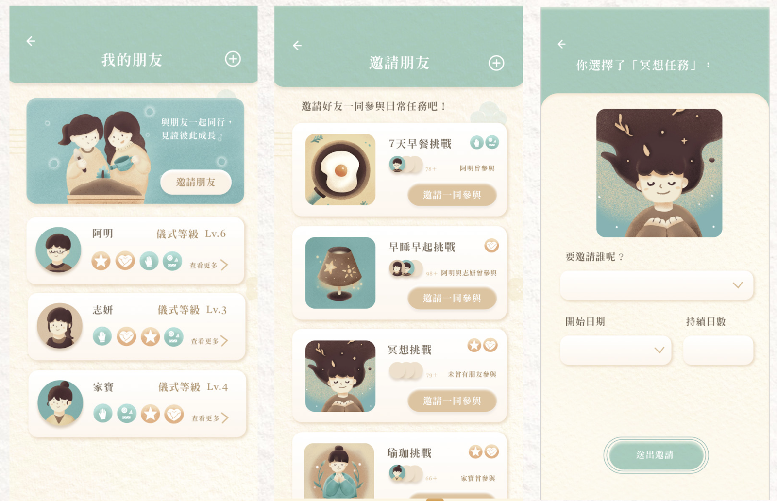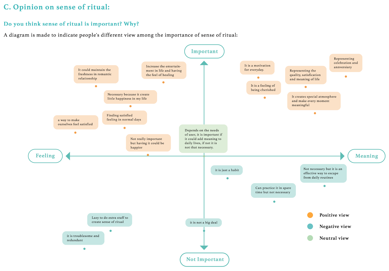 Practicing behaviour related to sense of ritual is a kind of lifestyle that is gradually on the rise, especially among adolescents. People would adopt simple action which is different from their daily routines like cooking a plentiful breakfast to create freshness in their life, or doing something unique with friends to create a feeling of ‘ritual’. In this project, application design will be the main element to support people to build up their personal routines, as application is an indispensable part in our daily life, which is easily accessible and convenient for use. Also, more function could be included and the daily activities could be tracked through the mobile app.Besides the application, some of the daily objects would also be included in such project, it works as a little side product to participate in user’s daily life, to practice daily rituals with users together to strengthen the user experience tangibly.