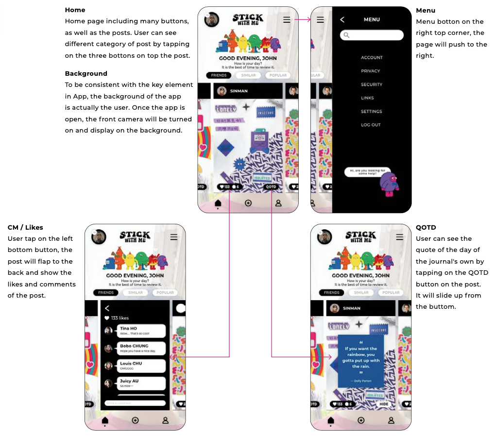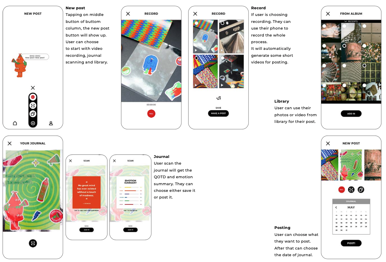 App - Social media app is another main focus in this project, as it used to assist with the journal to carry out some of the objectives. Besides of the basic social platform to share users’ journals, make friends, likes and comments or the list go on, there will also be some specialised functions included in the app. Firstly, a video auto generator is provided for the users to record their journaling process, as that is the most soothing event. With the sticker tearing or even the writing sound, it is stress-relieving to watch.Secondly, ‘a quote of the day’ and ‘emotion summary’ are allocated for each journal. With the use of stickers, it can generate the emotion summary of the day. Based on that, a quote of the day will be allocated to it, in order to inspire or encourage them.Thirdly, the app can link you with users around the world who share similar journals with you. With such common ground, users who are connected can have sharing based on their journal content and potentially be friends.