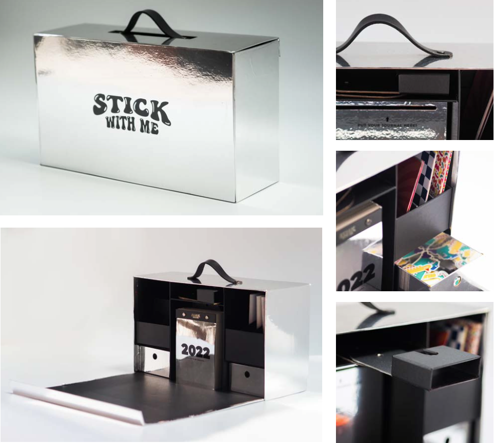 Packaging - In order to make the journal handy, all the material, like stickers and stationary, will be stored in one package. Therefore whenever they want to make their journey, they can open the box.Besides the basic materials, there will be a journal collection box in the packaging, users can put the journal inside after they finish journaling and recording. It is an individual box. So after the whole year, they can take it out and store it as they wish.Apart from that, there is a video auto generator as mentioned,so the packaging will have an extension phone stand for the user to put their phone on it and record the journaling process. As well as the lid of the packaging will be the working table for journaling.