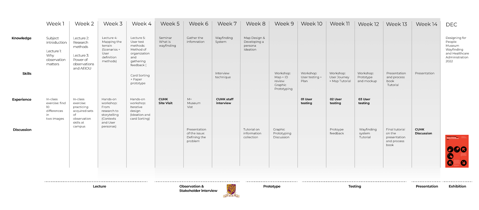 Designing a graphic information system for Art Museum of the Chinese University of Hong Kong Messages delivered in public spaces settings like museums, zoos and shopping malls require the voluntary cooperation of potential "receivers" while they are surrounded by distractions and choices. Visitors do not have to pay attention but are free to attend, ignore, or distort the messages being communicated. In such situations, it is immensely important to design information systems that not only reflect the needs and characteristics of audiences but also attract and hold their attention (Screven 1990). During the summer holidays, we contacted the Chinese University of Hong Kong and learned that they would be updating their orientation system. As the different structures were built in different eras, the Art Museum of the Chinese University of Hong Kong is looking for proposals to update the orientation system.All participants receive theoretical knowledge and simulation experiences over a period of four weeks. During this phase participants will have the opportunity to apply your knowledge of user-centred research to the environment. User research and user testing will be key elements of this phase, where all participants will be required to submit documentation of user testing and a different set of way finding prototypes.