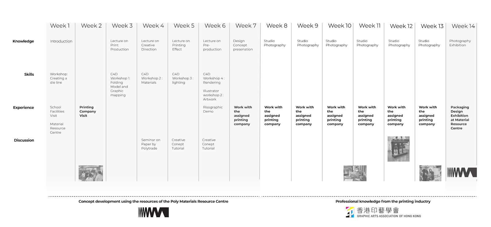 Packaging & Production TechnologiesInteractive The subject is divided into two parts, weeks 1-7 students will learn in depth about print production and use visualisation tools to present their concepts, after week 7 students will be required to discuss with staff from the print company and they will also be required to handle the art direction of their concepts in a studio photography workshop. Finally, they will be exhibiting their packaging designs in the Materials Resource Centre.